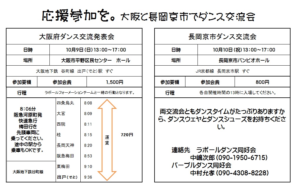 大阪ダンス交流発表会(10月9日)と長岡京市ダンス交流会でラポールダンス同好会の2チームがフォーメイション出演することになりました。両交流会への参加呼びかけです。