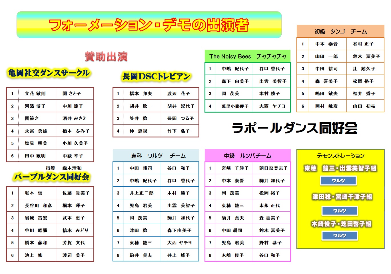 長岡京ダンススポーツ連盟が主催する第21回ダンス交流発表会に参加して、タンゴチームとルンバチームがフォーメーション出演しました。